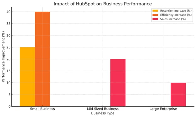 This graph illustrates the performance improvements experienced by different types of businesses using HubSpot, based on real case studies. It highlights how small businesses saw a 25% increase in client retention and a 40% boost in efficiency, while mid-sized businesses achieved a 20% increase in sales productivity. Large enterprises improved global sales by 10%. The graph provides a visual snapshot of the various benefits HubSpot offers to businesses of all sizes.
